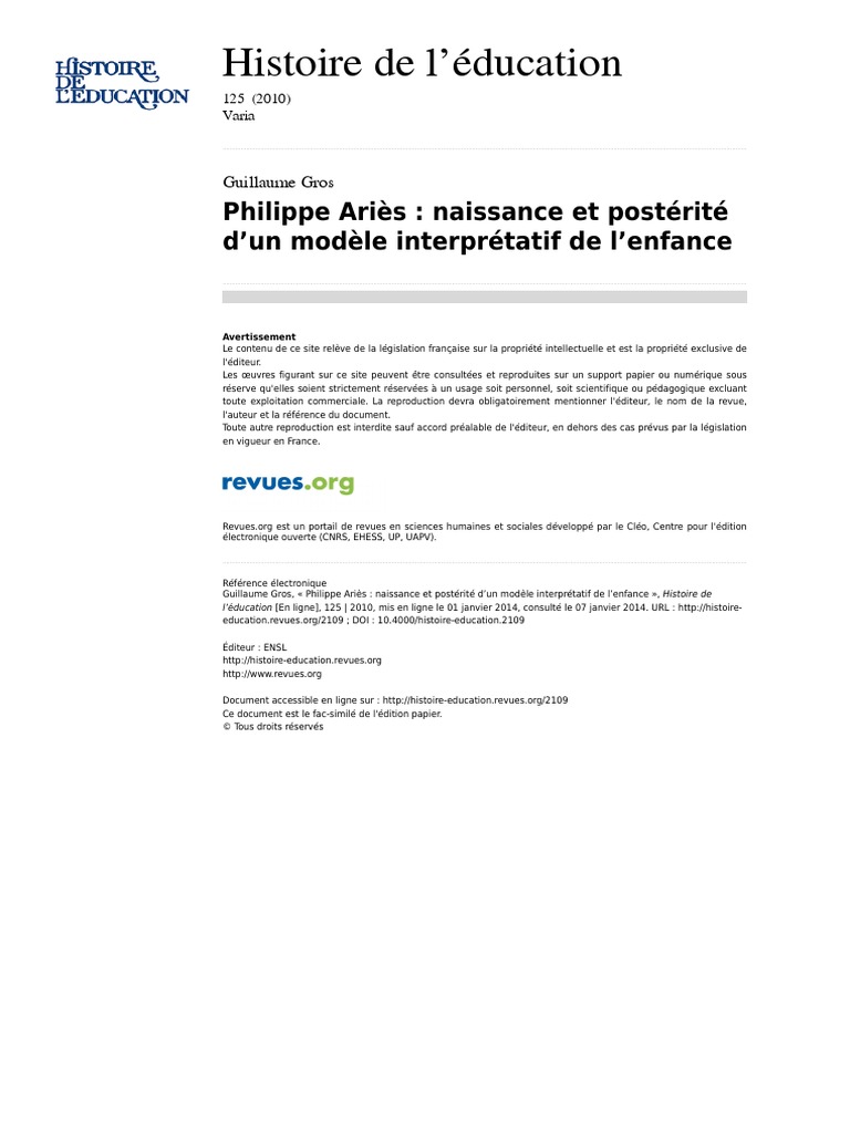 Histoire Education 2109 125 Philippe Aries Naissance Et