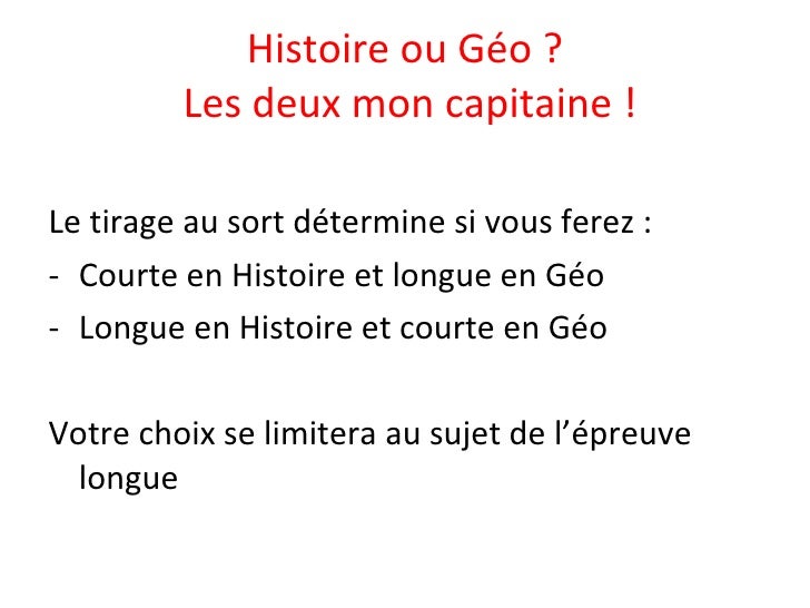 Un tirage au sort gardé secret jusquau jour de lépreuve détermine la discipline histoire ou géographie qui fera lobjet de la première partie la seconde partie portant sur lautre discipline. La première partie est notée sur 12 points. Vous êtes sur sur que cest un tirage au sort qui désigne laquelle des deux matière va tomber en majeur car jai du mal à mimaginer leducation nationale mettre des boules dans lurne.
